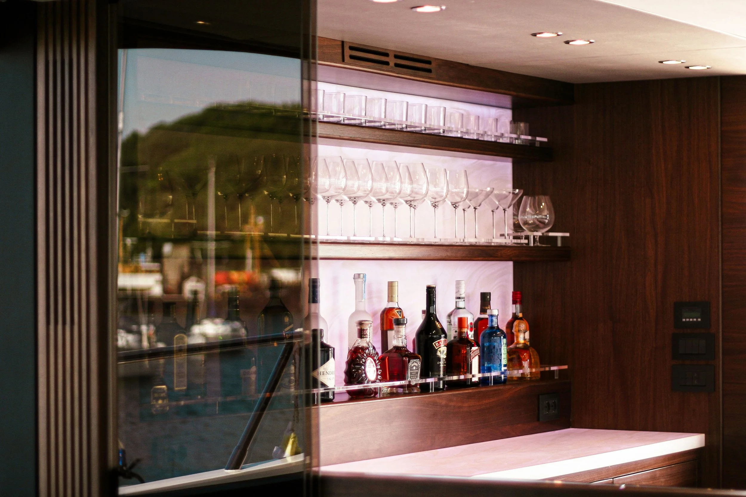 Interior of a boat bar featuring a curved white counter, a shelf with various alcohol bottles, glassware, and plush seating with white cushions.